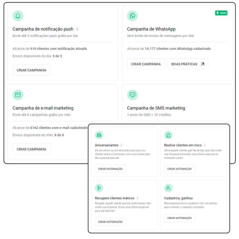 Ative o piloto automático com as campanhas automatizadas que irão trazer seus clientes de volta enviando ofertas na hora certa. Reative clientes em risco. Recupere clientes inativos. Envie campanhas para seus clientes para aumentar as vendas. Envie campanha de notificação Push, E-mail marketing, SMS marketing e Campanha de WhatsApp.