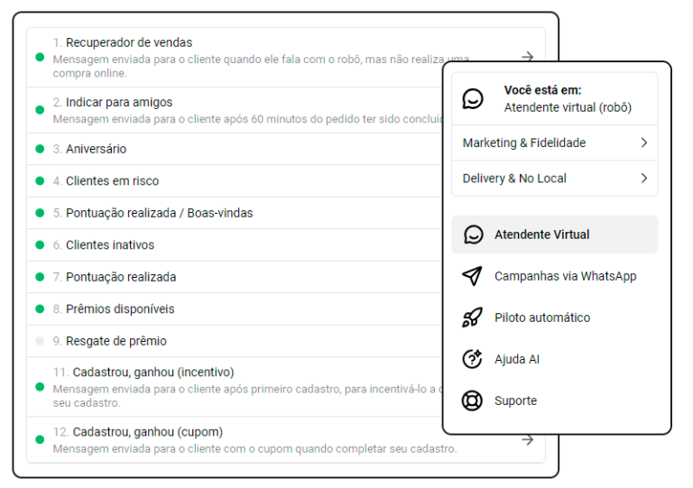 Basta conectar o WhatsApp da sua loja e ativar o robô. A partir daí, a nossa inteligência artificial responde às perguntas dos clientes, de acordo com os recursos ativados na plataforma: desde link de pedidos e informações da loja online, até o programa de fidelidade, pontos, prêmios e resgates. São dezenas de respostas possíveis. Caso nenhuma delas se aplique, ele irá chamar um atendente automaticamente. Além disso, ele enviará também automações sobre pedidos em andamento, programa de fidelidade e campanhas de marketing da plataforma. Todas as respostas e automações são editáveis e você pode escolher quais ativar. Você acompanha e gerencia tudo através do painel gerencial.